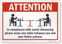 Social Distancing Sign: Attention - In Compliance With Social Distancing Please Leave One Table Between You And Your Fellow Patrons S2-4612