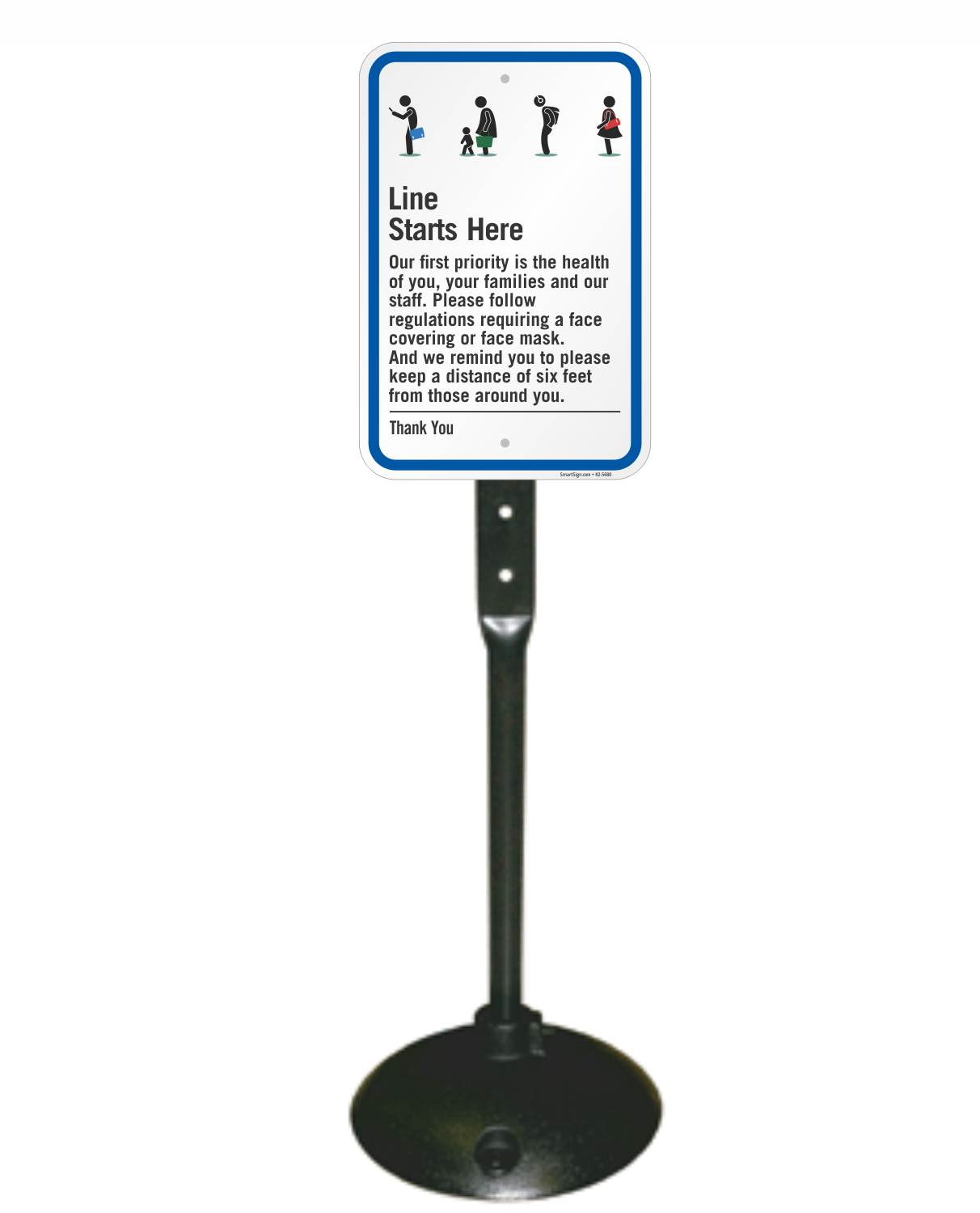Social Distancing Sign & Post Kit: Line Starts Here - Please Follow Regulations Requiring A Face Covering, Keep A Distance Of 6 Feet, Thank You Learn More...