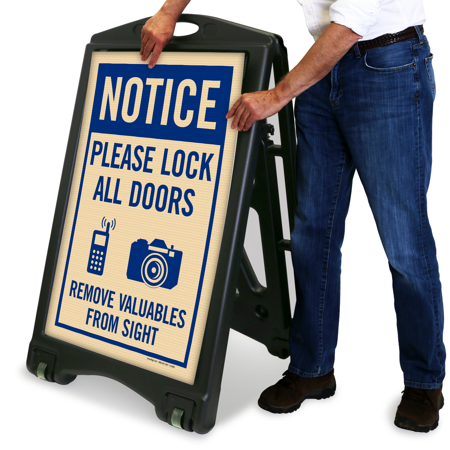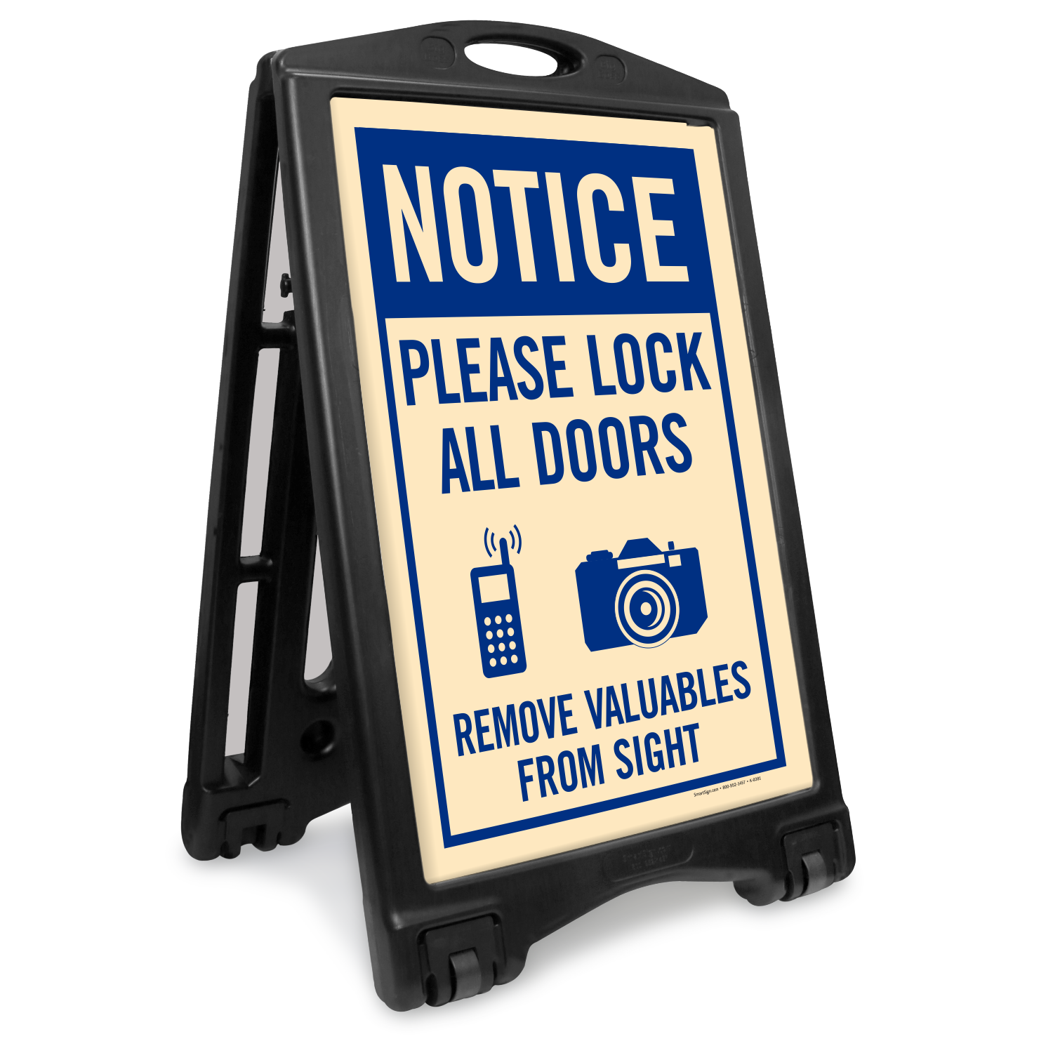 Use Sidewalk Notice Sign to remind people to lock doors of their vehicle and remove valuables like cell phone and cameras from sight.