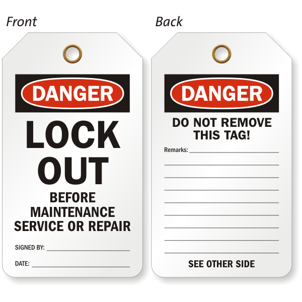 2-Sided OSHA Danger Safety Tag reminds maintenance personnel to perform lockout operations before servicing or repairing.