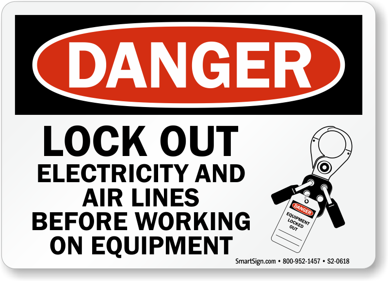 OSHA Danger Sign: Lock Out Electricity And Air Lines Before Working On Equipment (With Graphic)