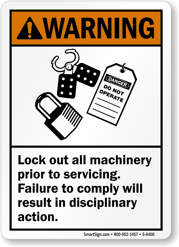 Sudden energization, start-up, or release of stored energy of a machine during servicing can injure any personnel. Use this ANSI warning sign to instruct workers to lock out the machines before its servicing.