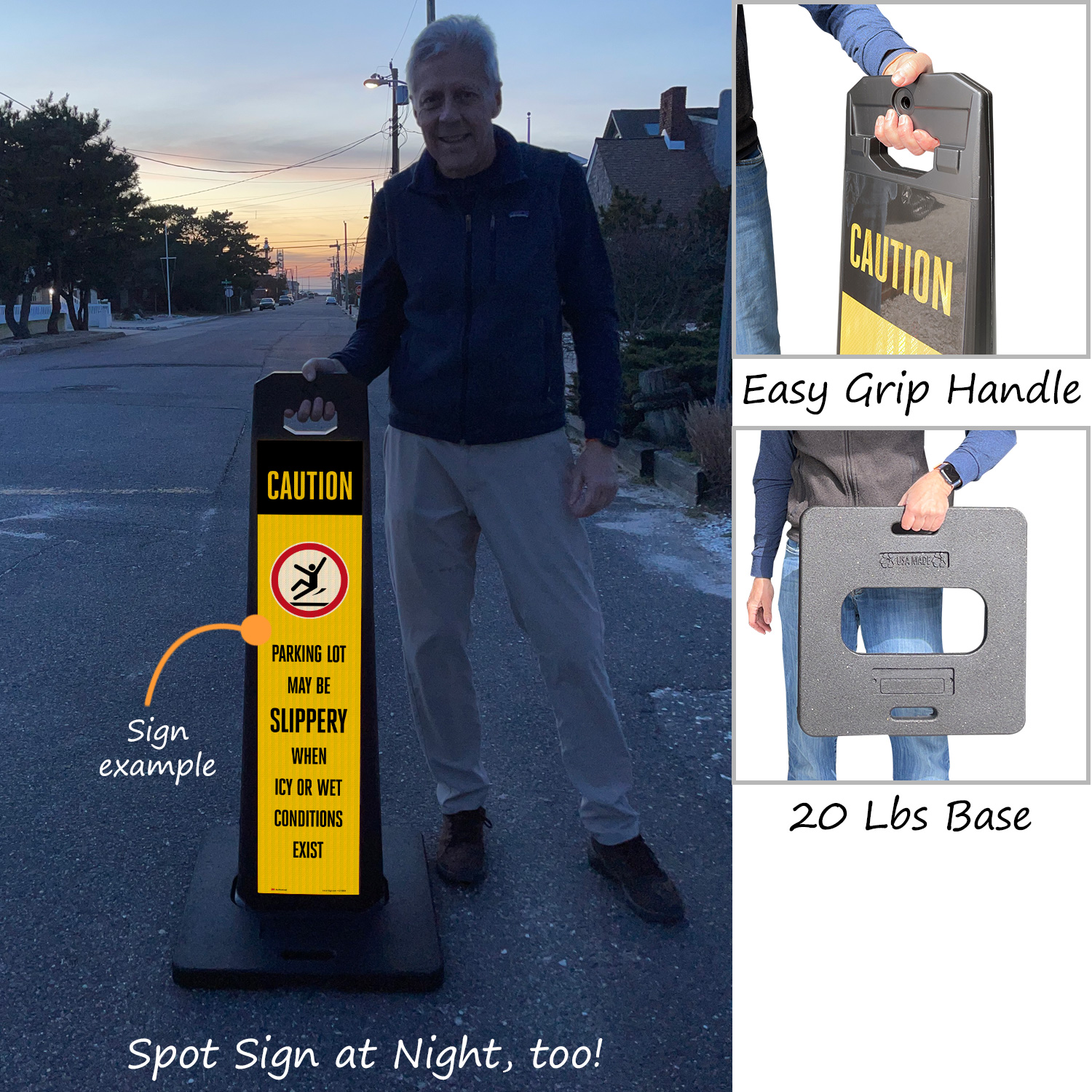 Sign panel and base are stackable for compact storage.