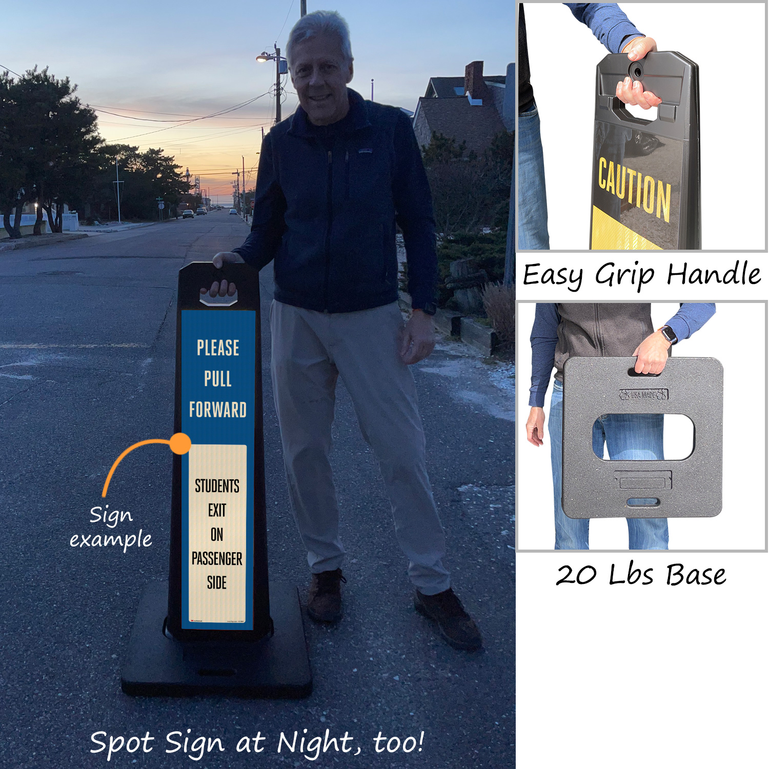 Sign panel and base are stackable for compact storage.