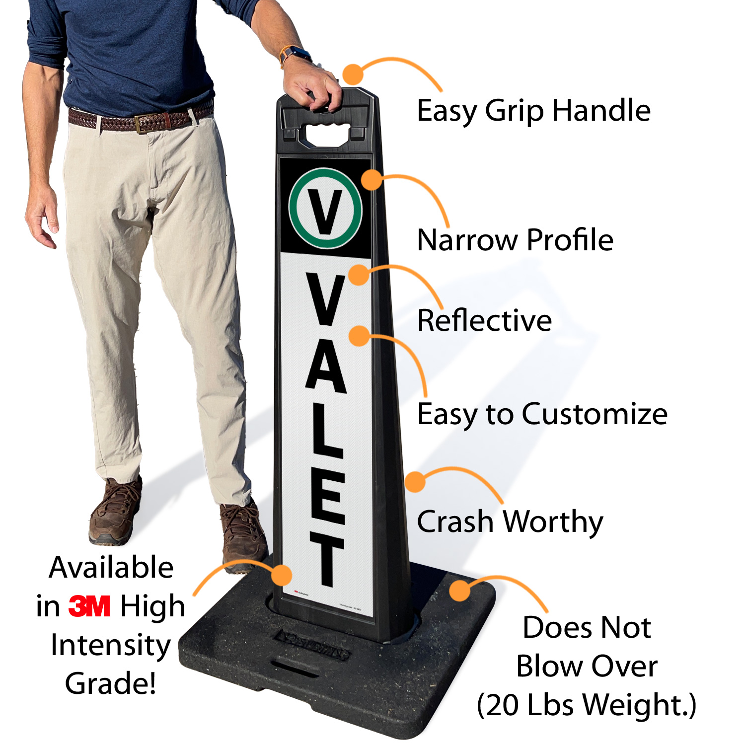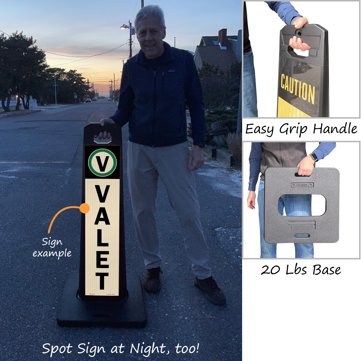 Sign panel and base are stackable for compact storage.