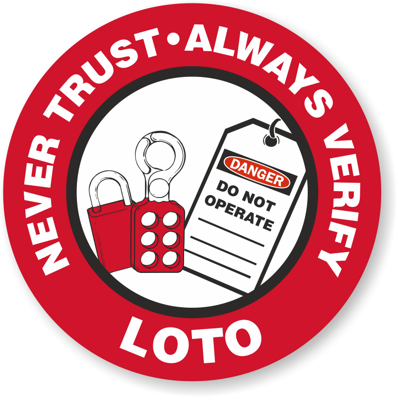 Make sure everyone confirms lockout tagout procedure is complete. This 'Never Trust, Always Verify' Lockout Hard Hat Decal ensures that dangerous machines are properly shut off and not able to start up again prior to the completion of maintenance or repair work.