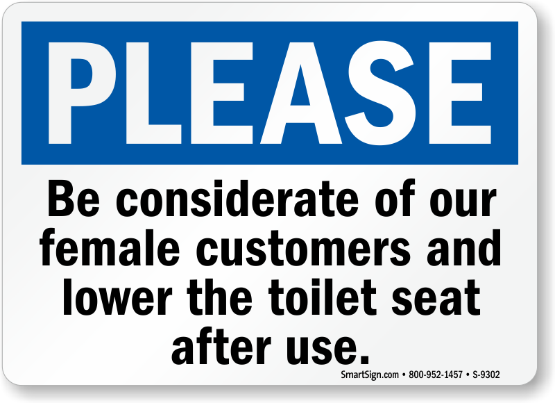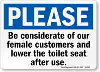 Restroom Sign: Please - Be Considerate Of Our Female Customers And Lower the Toilet Seat After Use. S-9302