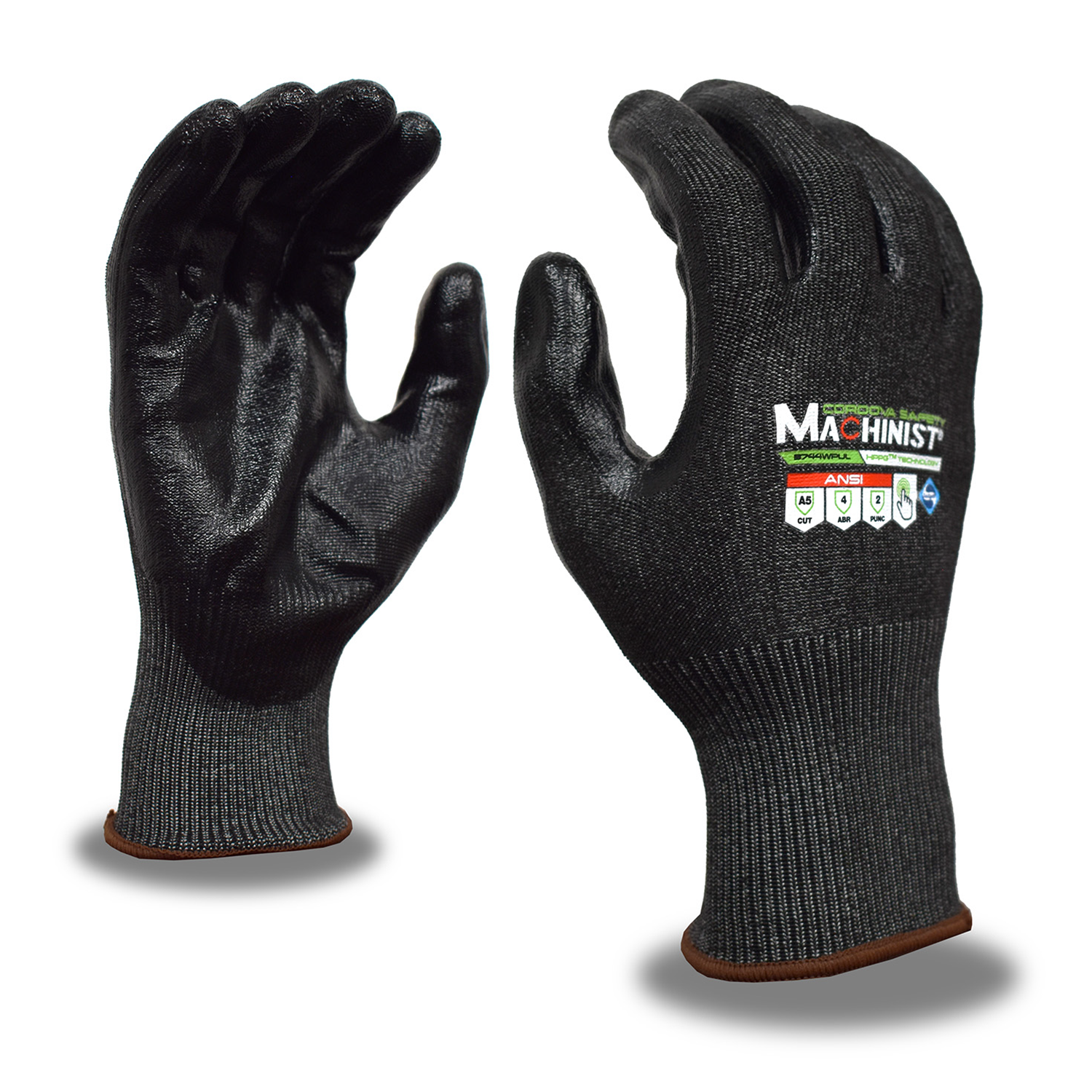 15-Gauge, HPPG fiber shell, sanitized treatment, with black water based polyurethane palm coating, touchscreen fingertips.