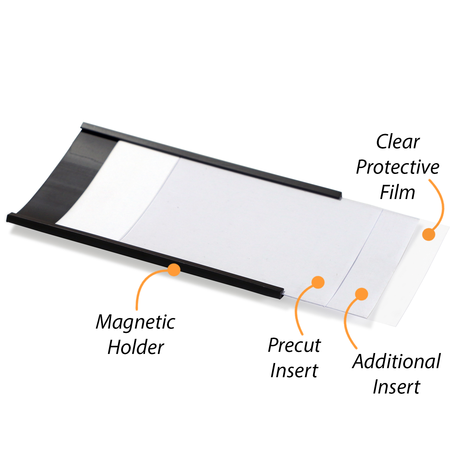 Our signature magnetic "C" Channel design lets you slide your labels into 100% magnetic material, assuring total adhesion to any metal surface.