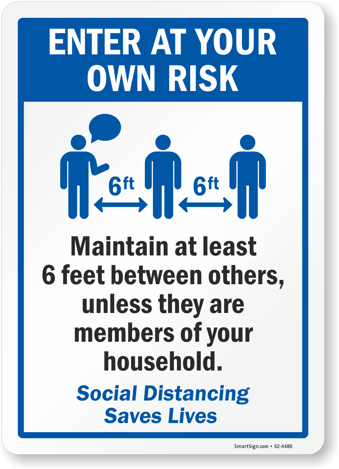 Pool Rules Sign: Enter At Your Own Risk - Maintain At Least 6 Feet Between Others, Unless They Are Members Of Your Household