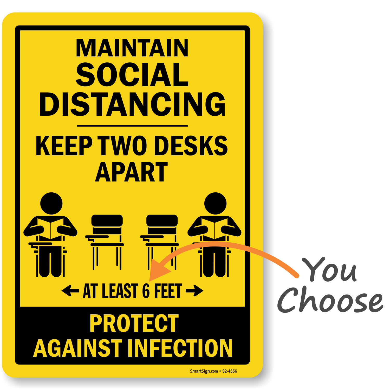 Explain very clearly how much distance must be maintained between two students by taking the example of desks - this Social Distancing Sign is easy to understand.