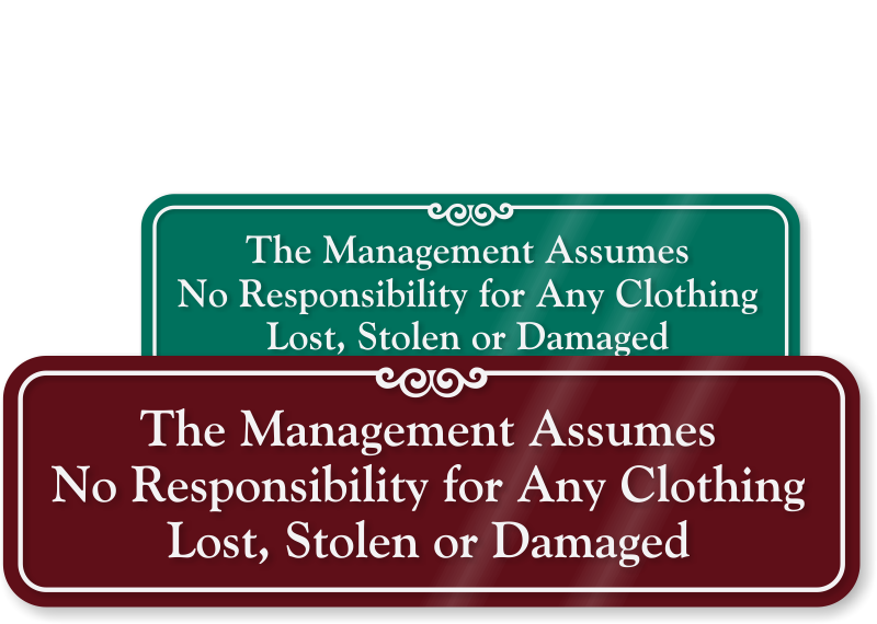 Decrease your liability and remind others to take extra care with their personal belongings. This ShowCaseâ„¢ Wall Sign effectively clarifies that the management assumes no responsibility for clothing lost, stolen, or damage. Sign is ideal for locker and changing rooms.