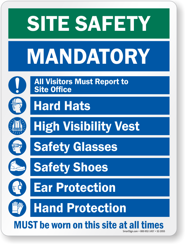 Job site safety is important. Install this sign enlisting mandatory actions ought to be taken by workers and visitors.