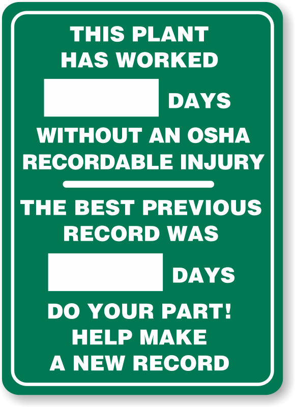 Mark-a-Dayâ„¢ Safety Scoreboards: This Plant has Worked [****] Days Without an OSHA Recordable Injury. The Best Previous Record was [****] Days. Do Your Part! Help Make a New Record. S-5012 Learn More...