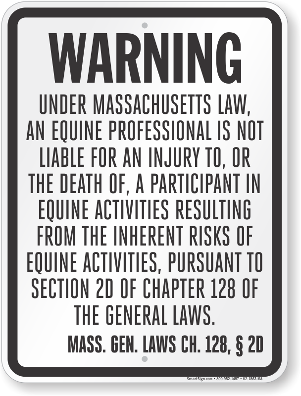 Tell people that the accidents resulting from "riding, training, assisting in veterinary treatment of, driving, or being a passenger upon an equine, whether mounted or unmounted, visiting or touring or utilizing an equine facility as part of an organized event or activity, or assisting a participant or show management" do not call for a compensation or lawsuit against the equine professional. This fully compliant Equine Liability Sign helps you conform to Massachusetts General Laws Title 12 Chapter 128 Section 2D.