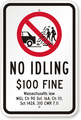 Massachusetts No Idling Sign: $100 Fine - Massachusetts Law Mgl Ch 90 Sct, 16A, Ch 111, Sct 142A, 310 Cmr 7.11 (with Idle Free Zone Symbol) K-9909-MA Learn More...