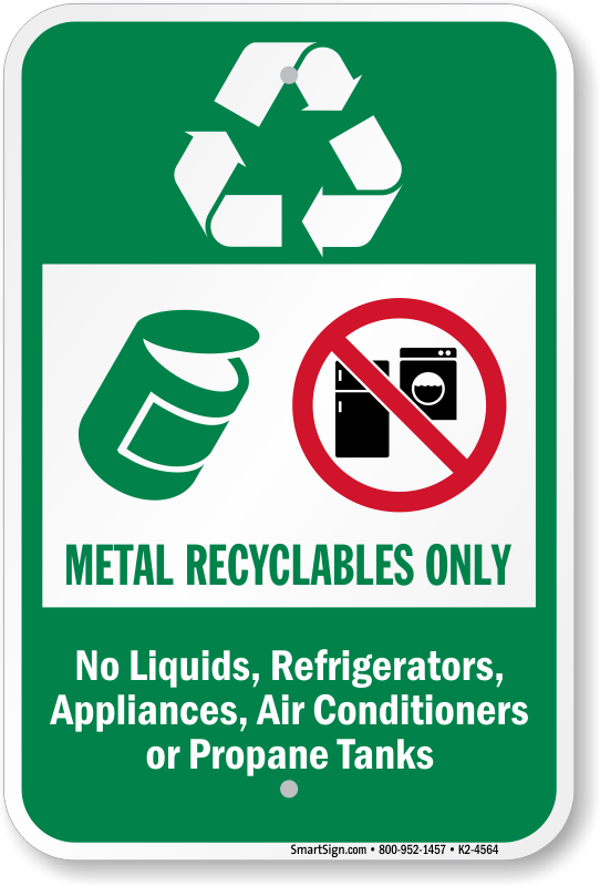 Recycling Sign: Metal Recyclables Only. No Liquids, Refrigerators, Appliances, Air Conditioners or Propane Tanks K2-4564