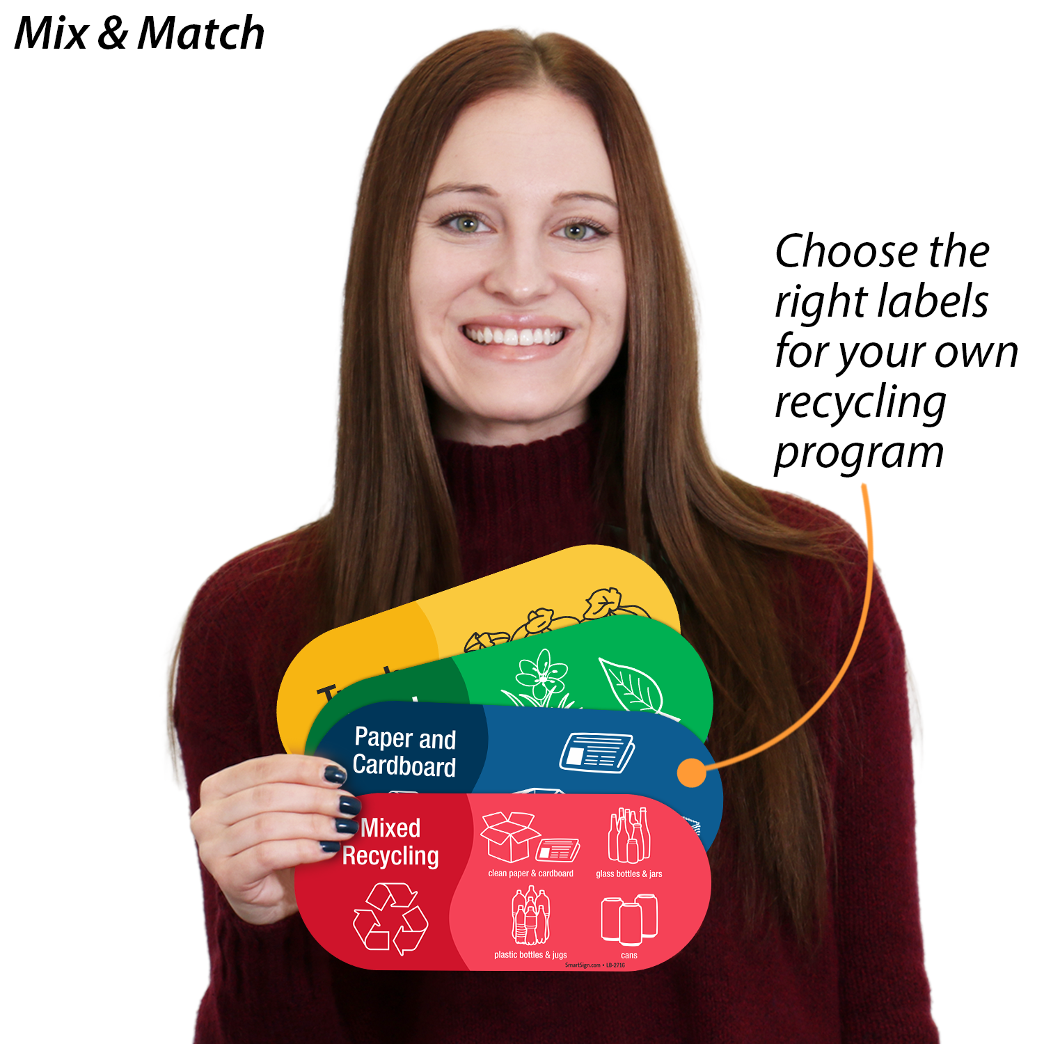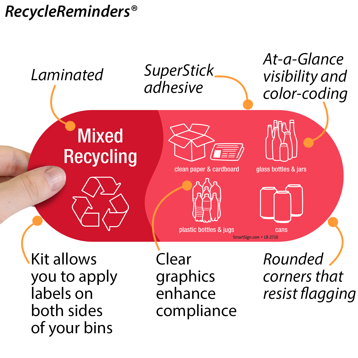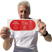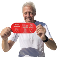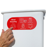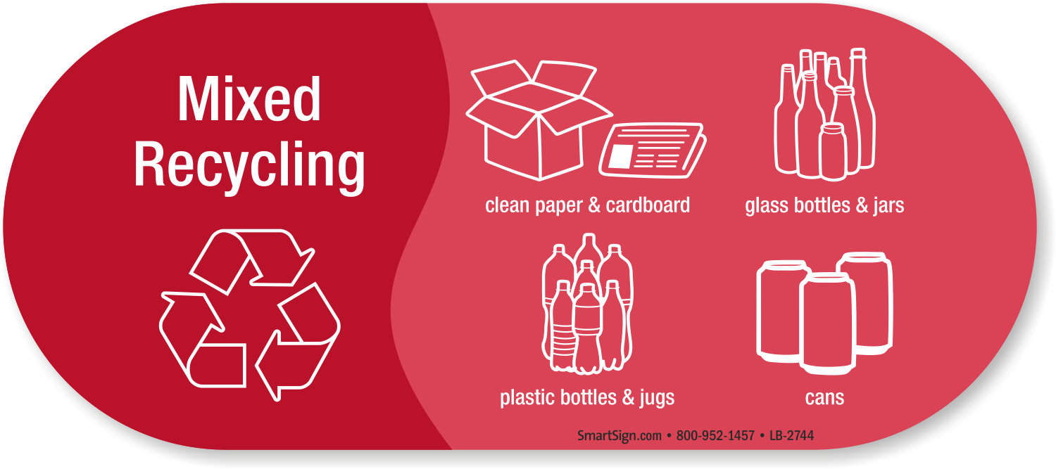 Sorting waste can be confusing. This Vinyl Recycling Sticker for mixed recycling allows people to throw away clean paper and cardboard, glass bottles and jars, plastic bottles and jugs, and cans - all in one bin.