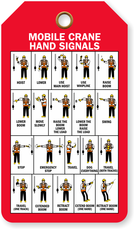 Ensure an accident-free crane operation. Use a 'Mobile Crane Hands Signals' Tag with graphics as a guide for correct and effective hand signals.