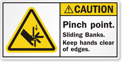 ANSI Caution Safety Label: Pinch Point, Sliding Banks, Keep Hands Clear Of Edges, LB-0141 Learn More...