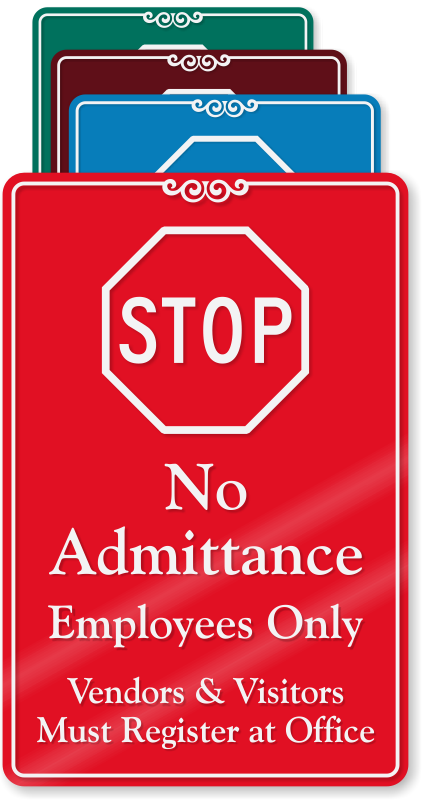 This STOP ShowCase Wall sign clearly informs all that entry is allowed for employees only and vendors and visitors must register at office. Select from a choice of background colors and install near your entranceway for an upscale look.