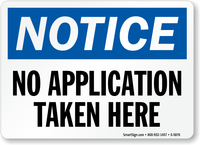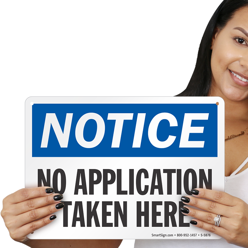 OSHA Notice Signs are a great help in making everyone aware of your rules. Post this OSHA Notice Sign outside your office or over your counter to inform all applicants that applications are not accepted there.