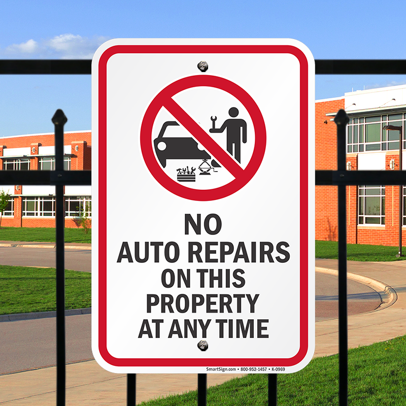 No Auto Repairs Sign: No Auto Repairs On This Property At Any Time (With Graphic) K-0969 Learn More...