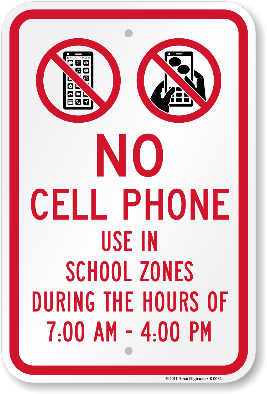 School Safety No Cellular Phone Sign: No Cell Phone Use In School Zones During The Hours Of 7.00 AM - 4.00 PM (With No Cell Phone and No Texting Symbol) K-0064