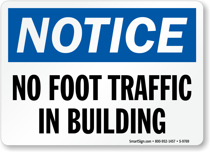Let visitors know, foot traffic is restricted inside the building, with our 'No Foot Traffic in Building' sign.