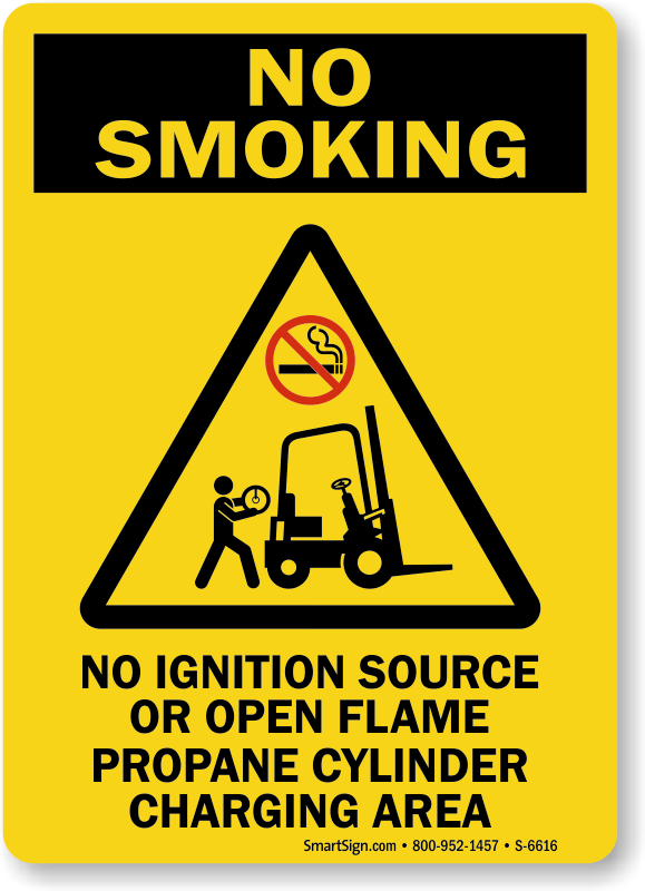 No Smoking Sign: No Ignition Source Or Open Flame, Propane Cylinder Charging Area (with Forklift Symbol) S-6616