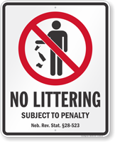 Nebraska No Littering Sign: Subject To Penalty, Neb. Rev. Stat. §28-523 K2-0062-NE Learn More...