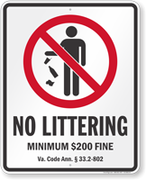 Virginia No Littering Sign: Minimum $200 Fine, Va. Code Ann. § 33.2-802 K2-0062-VA Learn More...