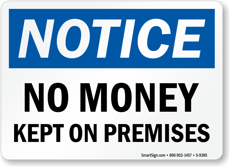 Discourage thieves from breaking in at night and looking for money on premises. Sign can be an effective tool in improving your facility's security.