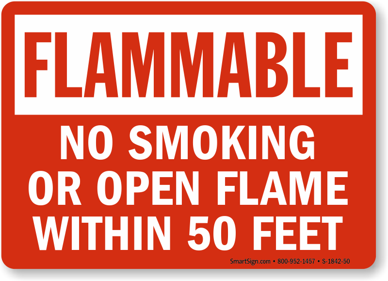 Keep everyone safe by installing no smoking or open flame within 50 feet signs in flammable areas.