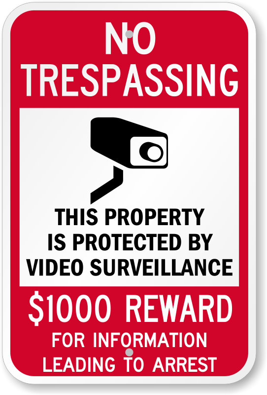 No Trespassing Sign: This Property Is Protected By Video Surveillance, $1000 Reward For Information Leading To Arrest K-0119 Learn More...