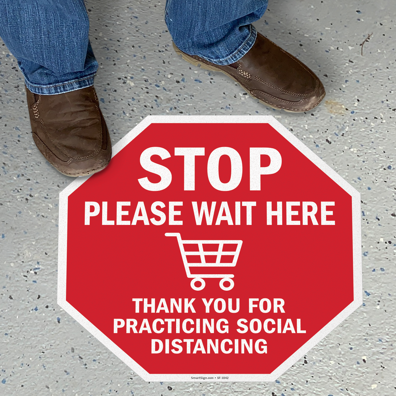 Have your customers practice social distancing by clearly indicating where they should wait with this conspicuous floor sign.