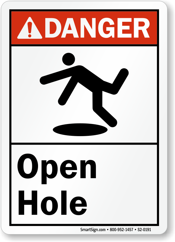 Open holes and pits can lead to grave fall accidents. Put up an ANSI Danger Sign that warns everyone with a graphic.