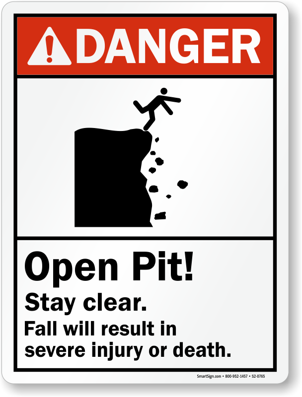 ANSI Danger Sign: Open Pit Stay Clear Fall Will Result In Severe Injury Or Death (With Graphic)