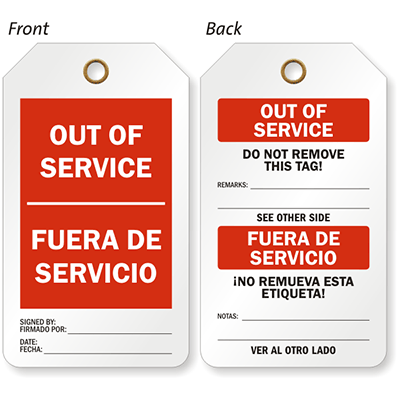 This red and white Bilingual English Spanish Safety 2-Sided Tag can be used to tag out-of-order machines, forklifts, and equipment in your facility.