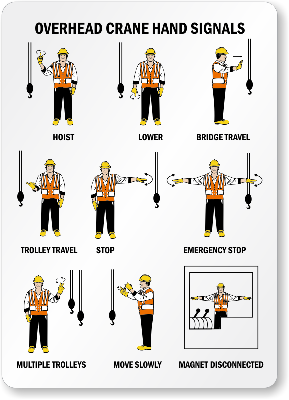 Prevent accidents during operation of cranes in your facility. Install this crane hoist warning label and remind crane operators of the standard overhead crane hand signals.