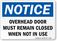 Remind everyone that overhead door must remain closed when not in use. The best way to ensure this is to install our effective OSHA Notice Sign in a visible location.