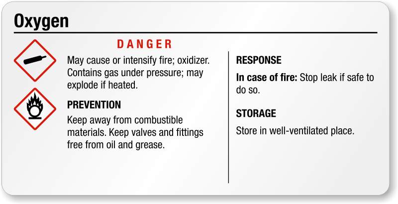 Oxygen gas cylinders can explode if heated. Warn your workers with this small Oxygen GHS Label and make sure the cylinders are handled properly.