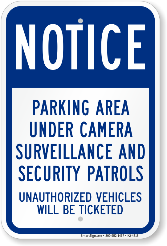 Parking Lot Security Sign: Notice - Parking Area Under Camera Surveillance And Security Patrols, Unauthorized Vehicles Will Be Ticketed K2-4818 Learn More...