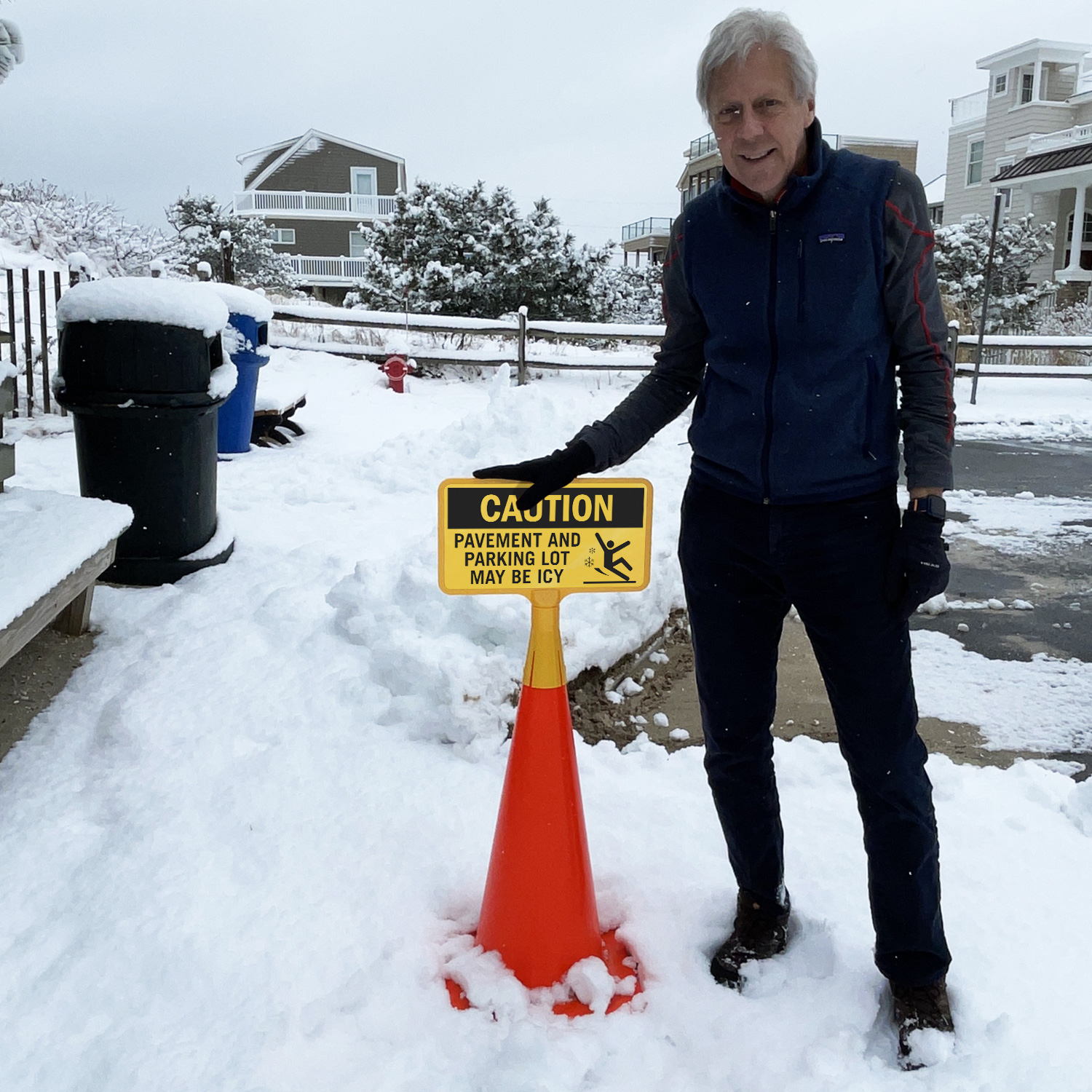 On icy days, place this highly visible no-tip, portable Traffic Cone Sign with caution message to warn everyone against slippery pavement and parking lot.