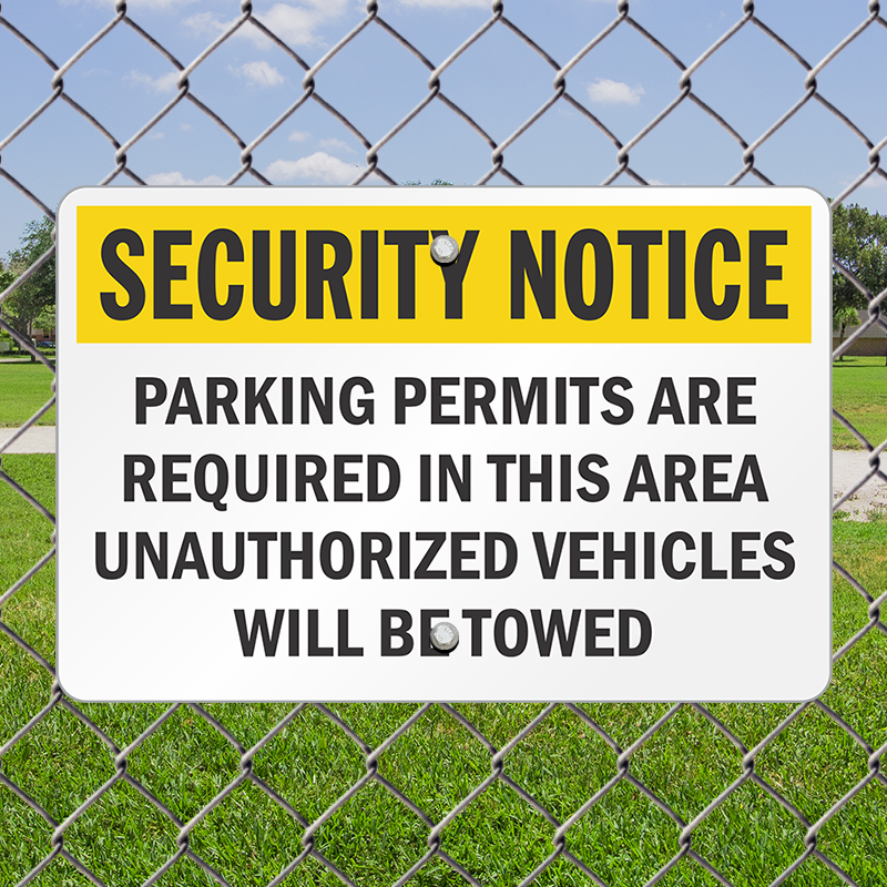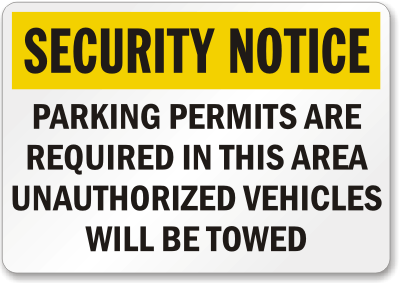 Security Notice Sign: Parking Permits Are Required In This Area Unauthorized Vehicles Will Be Towed Learn More...