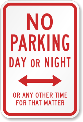 Parking Sign: No Parking Day Or Night Or Any Other Time For That Matter (with Bi-directional Arrow) K-4234 Learn More...