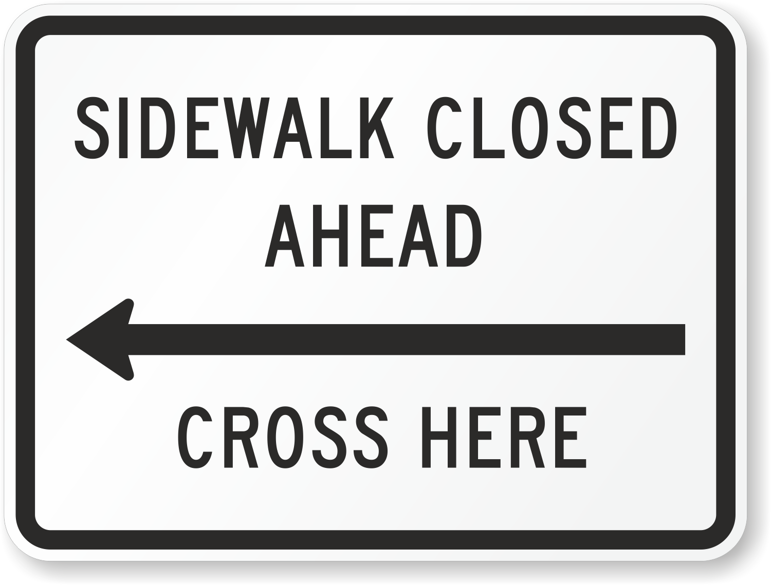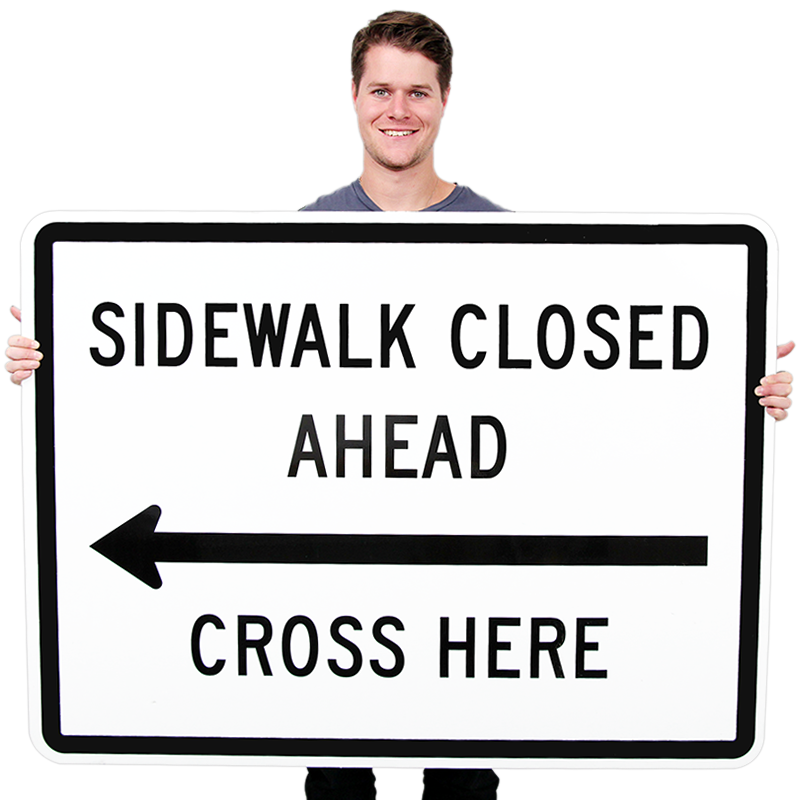 Guidance: 01 SIDEWALK CLOSED signs should be used where pedestrian flow is restricted. Bicycle/Pedestrian Detour (M4-9a) signs or Pedestrian Detour (M4-9b) signs should be used where pedestrian flow is rerouted (see Section 6F.59). 02 The SIDEWALK CLOSED (R9-9) sign should be installed at the beginning of the closed sidewalk, at the intersections preceding the closed sidewalk, and elsewhere along the closed sidewalk as needed. 03 The SIDEWALK CLOSED, (ARROW) USE OTHER SIDE (R9-10) sign should be installed at the beginning of the restricted sidewalk when a parallel sidewalk exists on the other side of the roadway. 04 The SIDEWALK CLOSED AHEAD, (ARROW) CROSS HERE (R9-11) sign should be used to indicate to pedestrians that sidewalks beyond the sign are closed and to direct them to open crosswalks, sidewalks, or other travel paths. 05 The SIDEWALK CLOSED, (ARROW) CROSS HERE (R9-11a) sign should be installed just beyond the point to which pedestrians are being redirected.