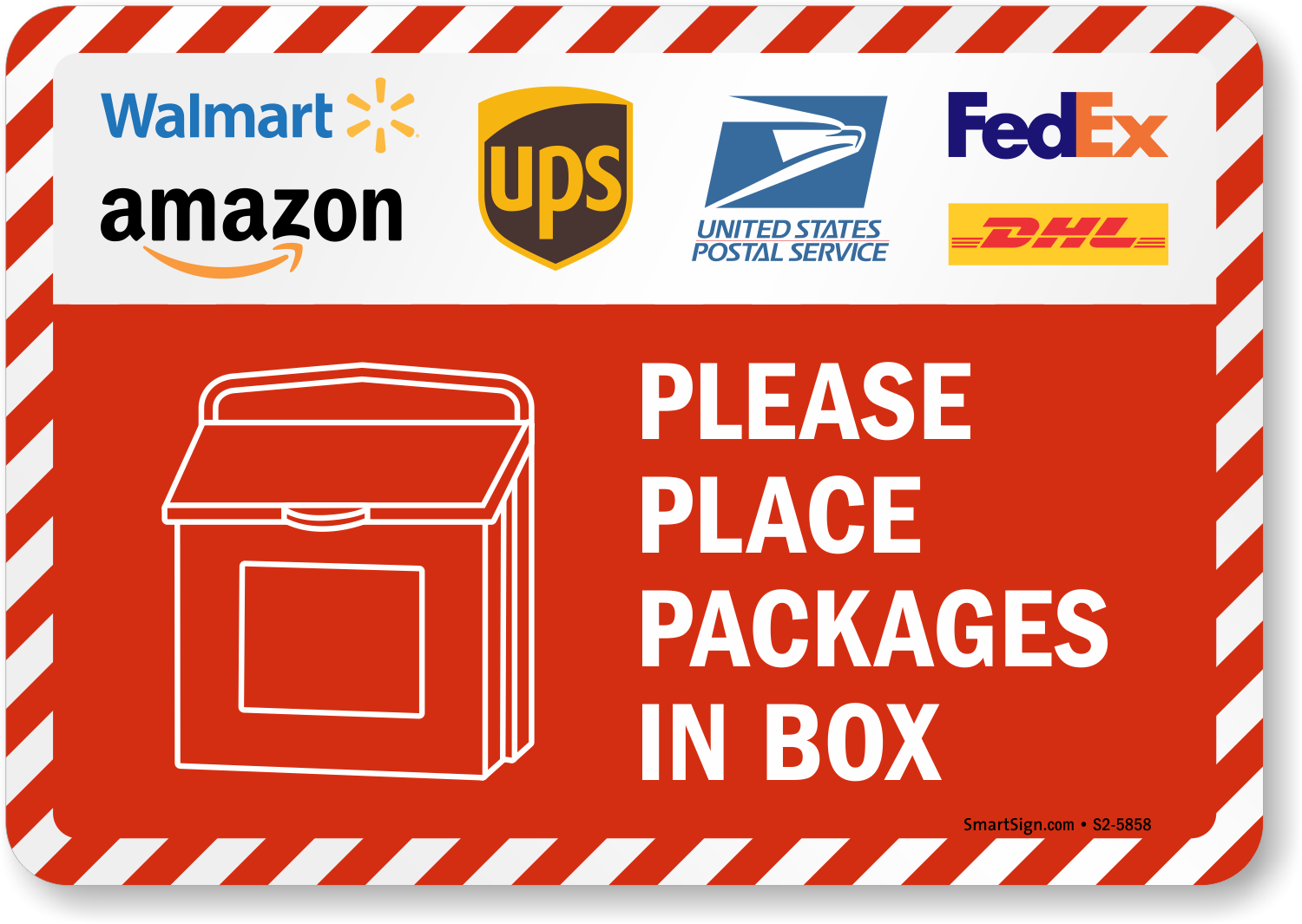 Package Delivery Sign: Please Place Packages In Box (With Amazon, FedEx, Walmart, UPS & USPS, DHL Graphics) S2-5858 Learn More...