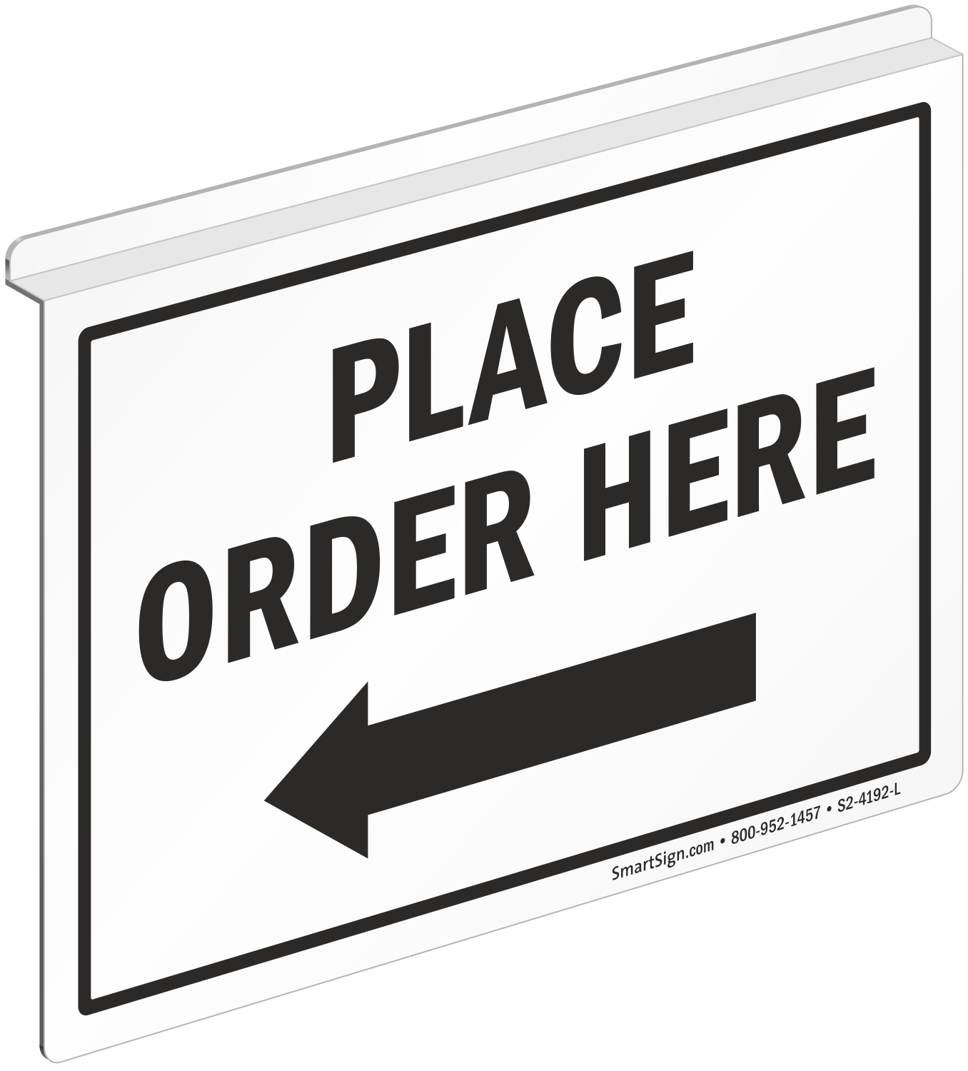 Our Z-Sign for Ceiling is really easy to install and can't be missed in a crowded space. Place Order Here Sign with Left Arrow calls for attention even from afar.