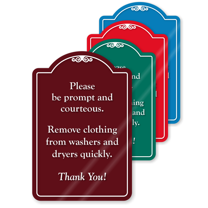 Politely request individuals to be prompt in removing clothes from washers and dryers, with our eye-catching designer sign.